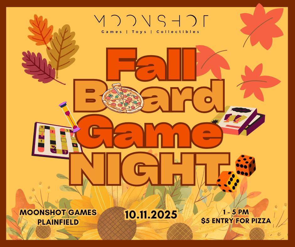 Join us at Moonshot Games - Plainfield for the Fall Board Game Night! Gaming and Pizza, what more could you want?When: Saturday October 11th 1pm-5pmWhere: 1620 E Main St Suite 151, Plainfield, IN 46168Entry: $5 (for Pizza)