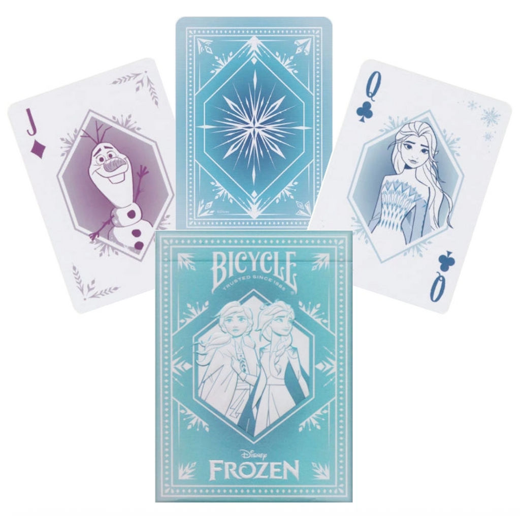 Immerse yourself in the magical world of Arendelle with Disney Frozen Inspired Playing Cards by Bicycle! The card backs feature a stunning icicle blue design, while the tuck case dazzles with a holographic foil snowflake, transforming your next card game into a winter wonderland. Elsa, Anna, Olaf, Sven, and other beloved characters bring their charm to the court cards, making this deck a delightful addition for any Frozen fan. Now available, these cards are perfect for adding a touch of magic to your game nights.
